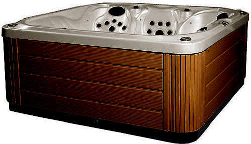 Venus 6 person Hot Tub in oyster opal with chocolate cabinet and grey cover. Size: 2300x2300x995mm.