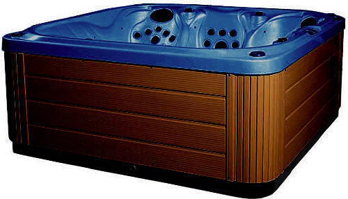 Venus 6 person Hot Tub in cloud blue with chocolate cabinet and light yellow cover. Size: 2300x2300x995mm.