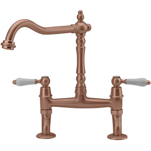 Tre Mercati Little Venice bridge kitchen tap in old copper finish with lever handles and swivel spout.