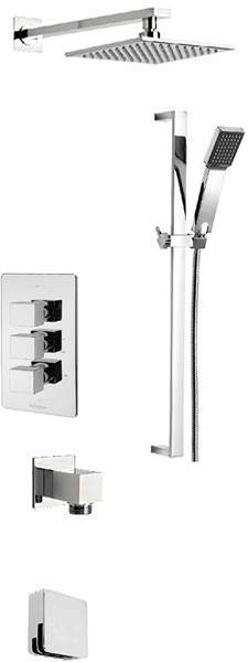 Thermostatic 3 way concealed shower valve in chrome with slide rail kit, wall outlet, square head, arm and auto bath filler waste.