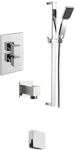 Thermostatic 2 way twin concealed shower valve in chrome with slide rail kit, wall outlet and auto bath filler waste.