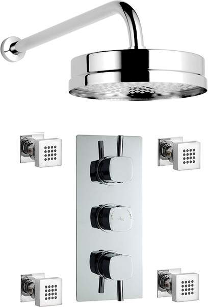 Triple concealed thermostatic shower valve in chrome with square fixed shower head, shower arm and 4 x body jets.