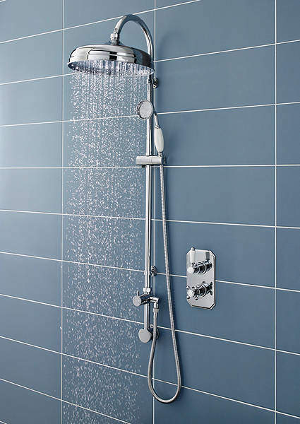 Pioneer traditional twin concealed thermostatic shower valve. Polymer construction with chrome plated brass trim set and rigid riser kit.