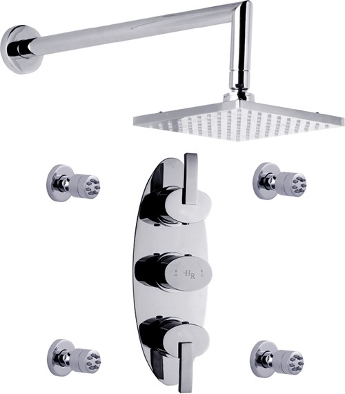 Triple concealed thermostatic shower valve in chrome with square fixed shower head and body jets.