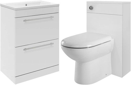 Design vanity unit in white with ceramic basin (option 2), back to wall unit, pan, cistern and soft closing seat.