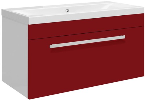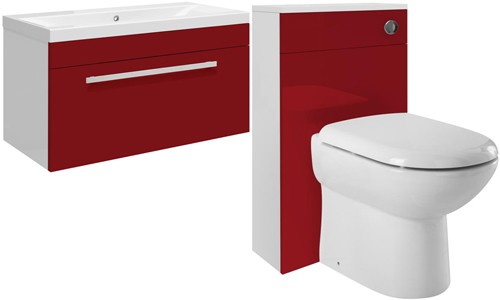 Design wall mounted vanity unit in red with ceramic basin (option 2), back to wall unit, pan, cistern and soft close seat.