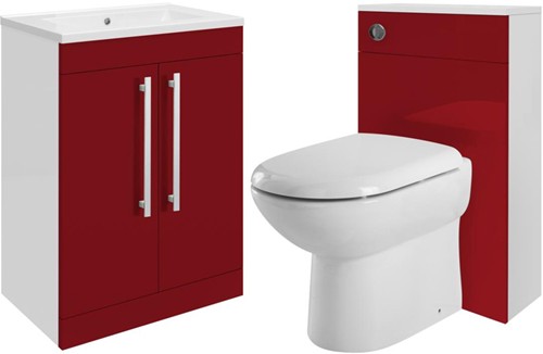 Design vanity unit in red with ceramic basin (option 2), back to wall unit, pan, cistern and soft close seat.