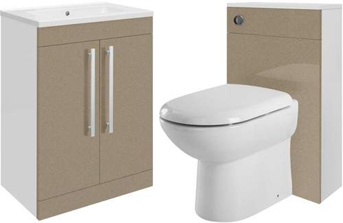 Design vanity unit in caramel with ceramic basin (option 2), back to wall unit, pan, cistern and soft close seat.