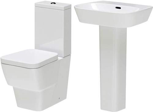 Cambria four piece bathroom suite with flush to wall toilet pan, seat, push flush cistern, basin and full pedestal.