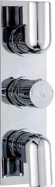 - Triple shower valve with 2 outlets, 1 control for temperature, and 2 independent controls for water flow through each outlet.