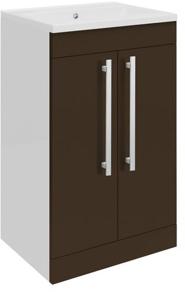 Design 500 Compact vanity unit in brown with ceramic basin, toilet, cistern and soft close seat.