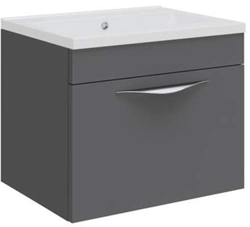 500mm compact wall hung vanity unit in gloss grey with chrome handle and basin.
