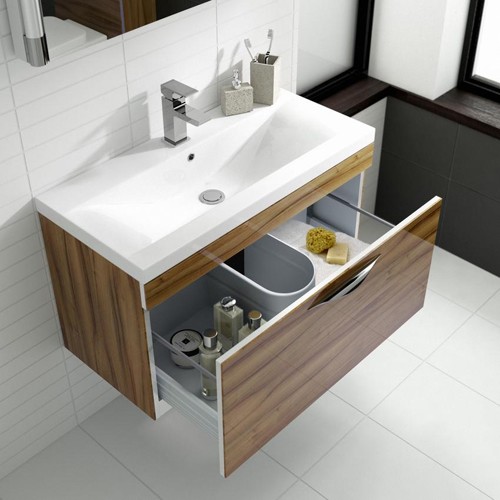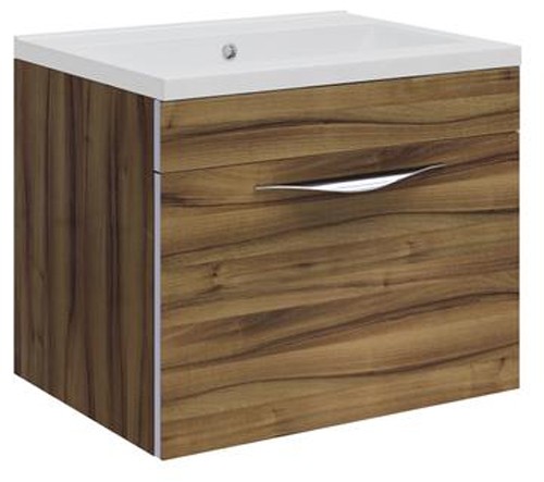 500mm compact wall hung vanity unit in gloss walnut with chrome handle and basin.