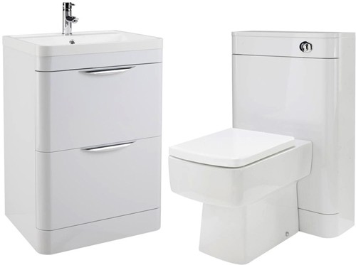 Parade vanity unit in white with curved corners, drawers, basin, back to wall unit, toilet pan, concealed cistern and seat.