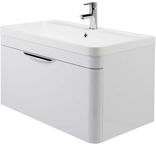 Parade wall mounted vanity unit in gloss white with drawer, curved corners and basin.