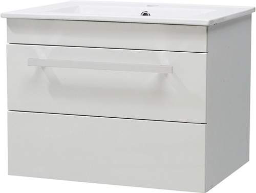 Wall mounted vanity unit in white with soft close drawer and 1 tap hole ceramic basin. Size 600W x 450H x 400D mm.