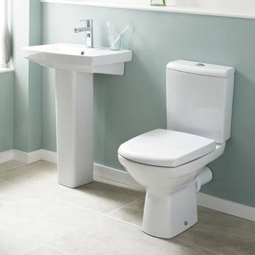 Hamilton four piece bathroom suite with toilet pan, push flush cistern, seat, 550mm basin and full pedestal.