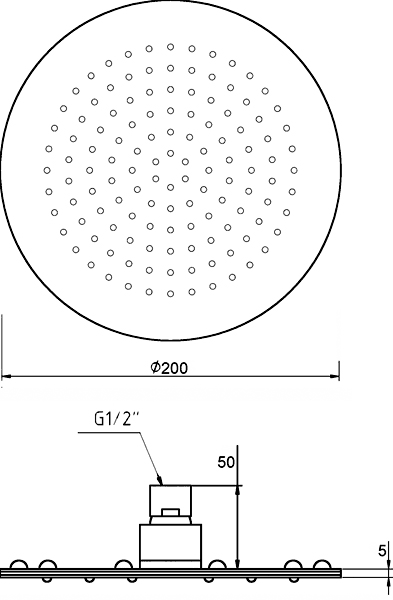 Round shower head in chrome with wall mounting arm. Size 200mm. 5mm thick.