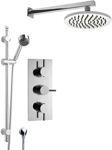 Crown shower set with thermostatic triple concealed shower valve (chrome), diverter, 200mm round shower head, wall mounting arm, slide rail and round shower handset.