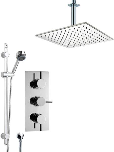 Crown shower set with thermostatic triple concealed shower valve (chrome), diverter, 400x400mm square shower head, ceiling mounting arm, slide rail and round shower handset.