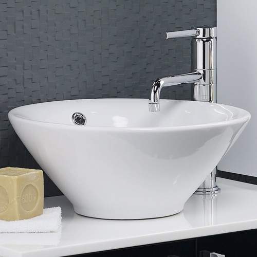 Round freestanding vanity basin with no tap holes. 440mm diameter. 170mm deep. Bathroom tap and waste not included.