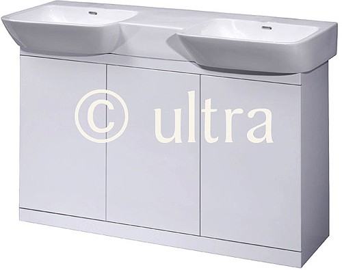 Floor standing vanity unit in white with built in cupboard and double ceramic basin. Size 1200W x 695H x 500D mm.