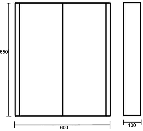 Mirror bathroom cabinet with 2 hinged doors. Size 600W x 650H x 100D mm.