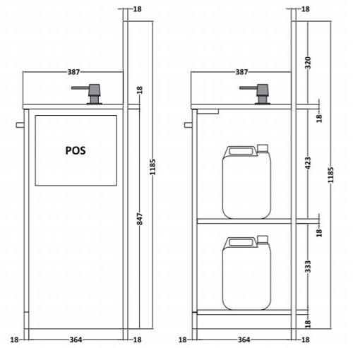 Nuie 8 x floor standing hand sanitiser stations in driftwood/stone grey finish with pump dispensers.