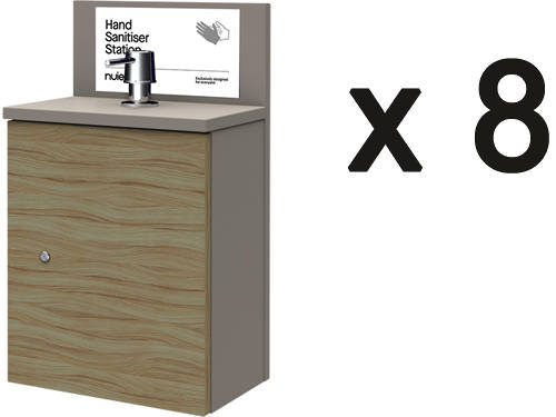 Nuie 8 x wall mounted hand sanitiser stations in driftwood/stone grey finish with pump dispensers.