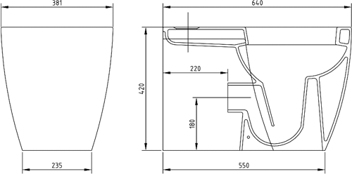 Darwin flush to wall toilet pan with seat, cistern and push button flush.