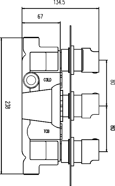 - Triple shower valve with 2 outlets, 1 control for temperature, and 2 independent controls for water flow through each outlet.
