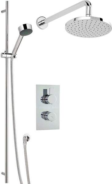 3/4" Twin concealed thermostatic shower valve in chrome with built in diverter, slide rail kit, round fixed shower head, wall outlet, shower handset and hose.