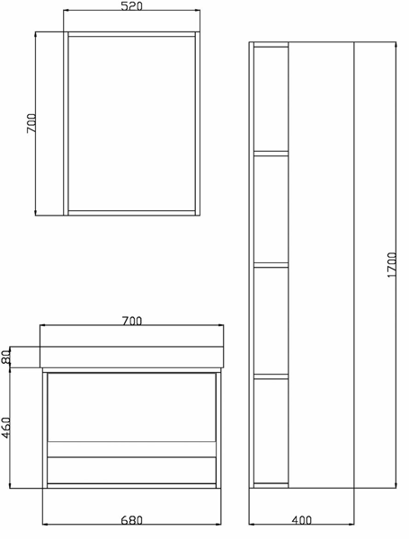 Recess wall hung bathroom furniture set in dark oak with wall mounted vanity unit, free standing basin, mirror and side storage unit.