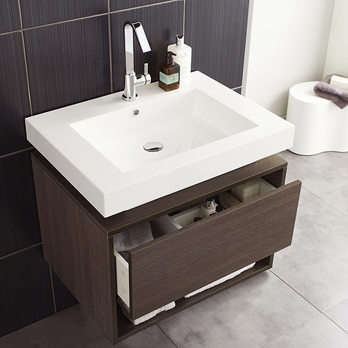The dark-oak-finish Hudson Reed Recess pack lives up to its name with a recess in the vanity unit, which features a raised polymarble basin and soft-close metal box drawer. The side cabinet continues the theme with several display recesses and a mirrored cupboard. The matching recessed mirror completes the pack.