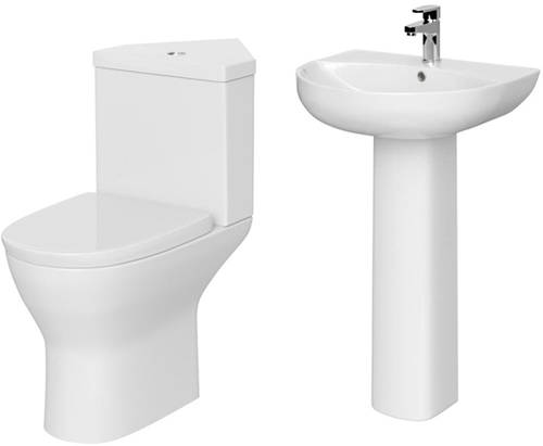 Saffron four piece corner bathroom suite with toilet pan, cistern, soft close seat, basin and full pedestal.