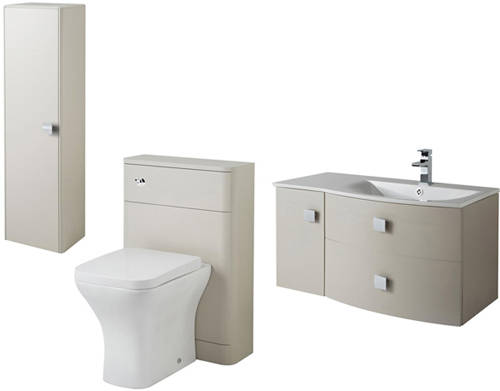 Hudson Reed Sarenna 1000mm wall mounted right handed vanity unit in cashmere finish with 500mm floor standing WC unit and 350mm wall mounted tall storage unit.