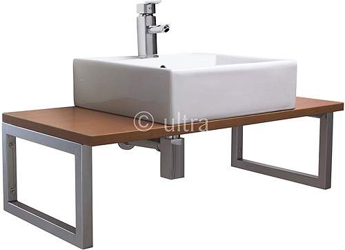 Vanity shelf in calvados brown with chrome brackets and square freestanding basin.