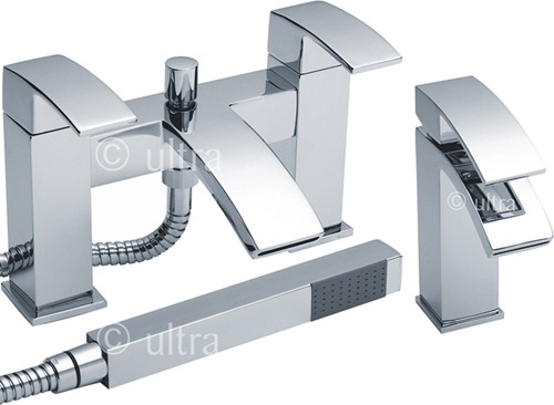 Ultra's Vibe range of showers and taps are manufactured from solid brass and have easy to use curved lever handles and modern waterfall spouts.