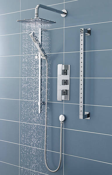 Vibe triple concealed thermostatic shower valve set in chrome with diverter. Square fixed shower head, slide rail kit and a rainbar.