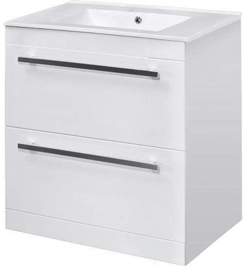Cardinal vanity unit in white with drop down door, drawer and ceramic basin.