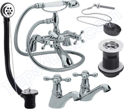 Mixer pack with bath shower mixer (small handset), basin taps and wastes.
