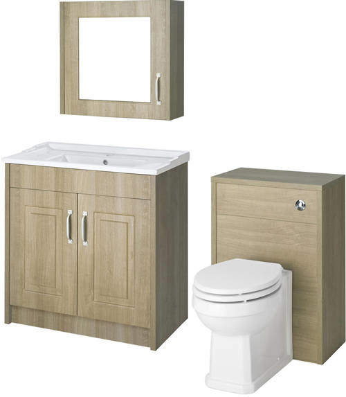 York traditional 800mm vanity unit with ceramic basin, 500mm WC unit and mirror cabinet in oak.