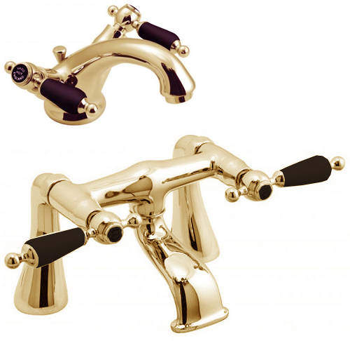 Kensington traditional mono basin mixer and bath filler taps pack in antique gold and black with pop up basin waste.