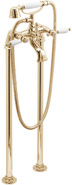 Kensington traditional basin taps and floorstanding bath shower mixer tap in antique gold and white with shower kit.