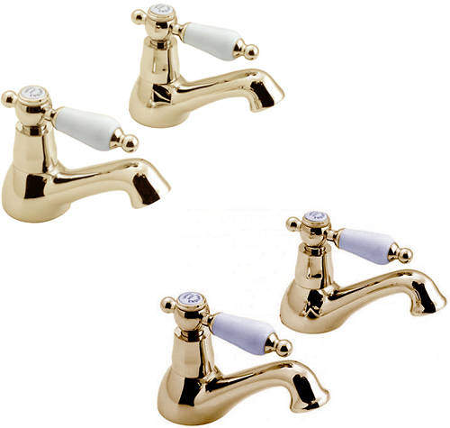 Kensington traditional basin and bath taps pack in antique gold and white.