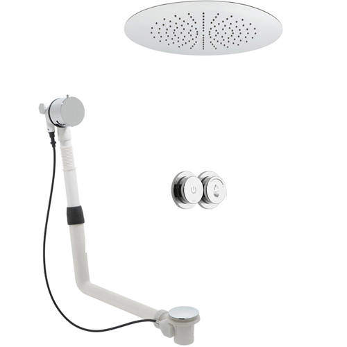 Vado Sensori SmartDial thermostatic shower valve in chrome with shower and bath outlets, ambient LED lighting, Sky round ceiling mounted head and bath overflow filler waste.