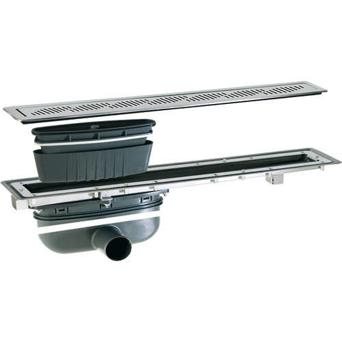 Van Den Berg Vinyl flooring shower channel drain with 50mm horizontal outlet and stainless steel grating (800x100mm).
