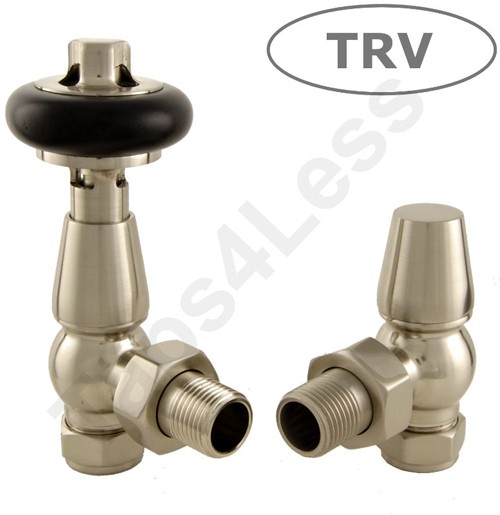 Faringdon thermostatic angled radiator valves in satin nickel (pair).