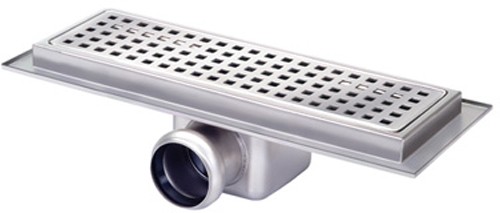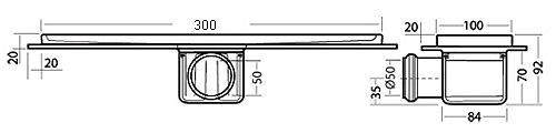 Rectangular wetroom shower channel with side outlet. Size 300x100x95mm.