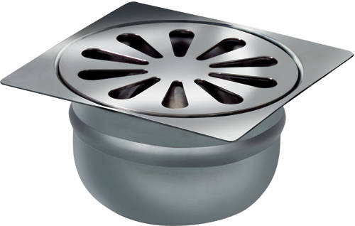 Square wet room gully with screw down stainless steel grate and bottom outlet (100x100mm).